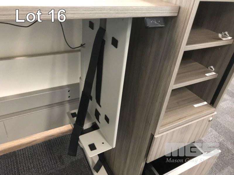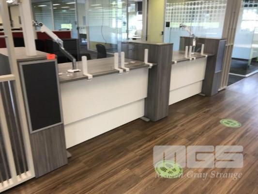 RECEPTION COUNTER, 2 PERSON, SCHIAVELLO, WITH ELECTRIC ERGONOMIC DESKS, 3 X DOCUMENT COMPARTMENTS & DRAWERS, MONITOR ARMS, CPU BRACKETS & PERSPEX SCREENS