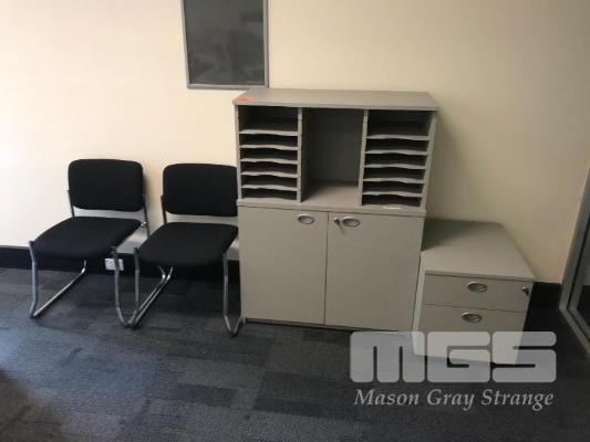 UNDER DESK MOBLE, 2 X VISITORS CHAIRS & DOCUMENT PIGEONHOLE UNIT, SCHIAVELLO, GREY LAMINATE
