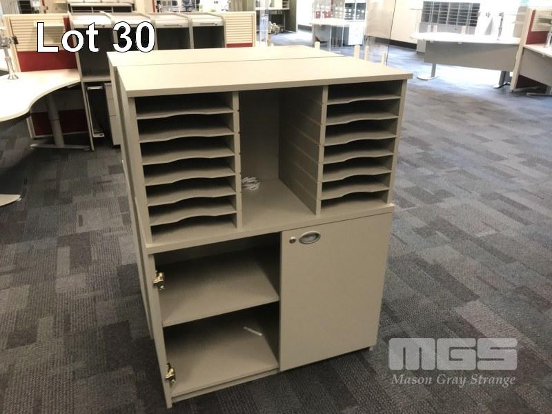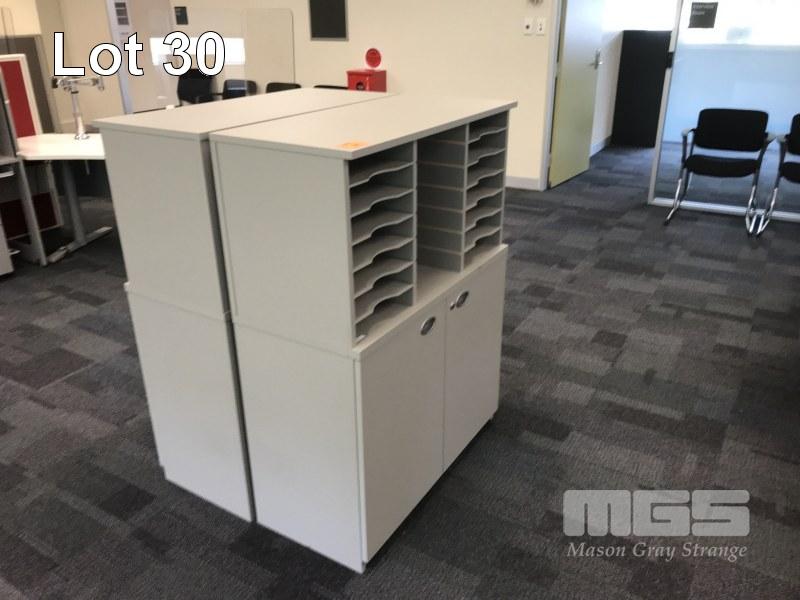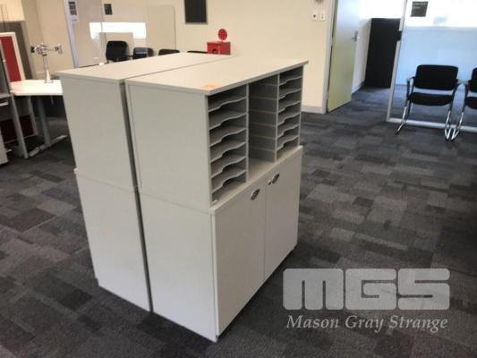 PAIR OF DOCUMENT PIGEONHOLE UNITS, SCHIAVELLO, GREY LAMINATE WITH 2 DOOR UNDERSTORAGE, 1 DOOR ALL FAULTS BUT WITH LOT