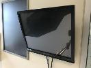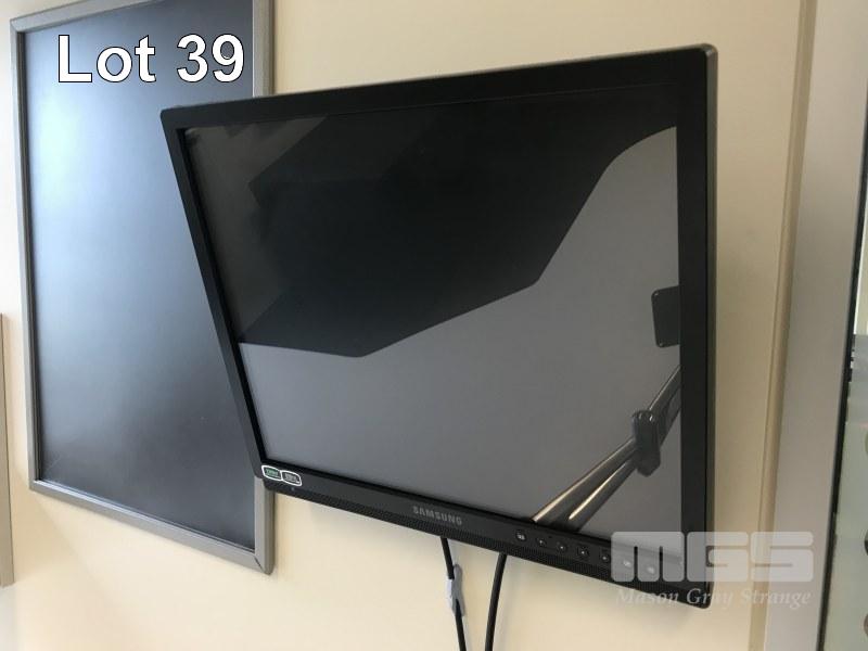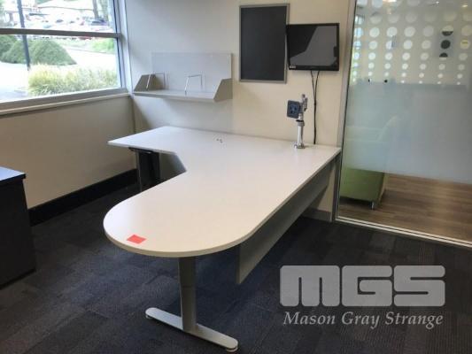 CORNER OFFICE DESK, WHITE LAMINATE, ERGONOMIC WITH MONITOR ARM WALL MOUNT DOCUMENT SHELF, PERSPEX WALL MOUNT NOTICE BOARD & WALL MOUNT SAMSUNG MONITOR