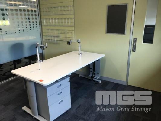 OFFICE DESK, WHITE LAMINATE, ERGONOMIC WITH 2 X MONITOR ARMS, UNDERDESK MOBILE, PERSPEX WALL MOUNT NOTICE BOARD & SLATWALL PAMPHLET HOLDER