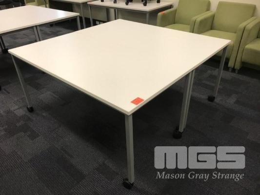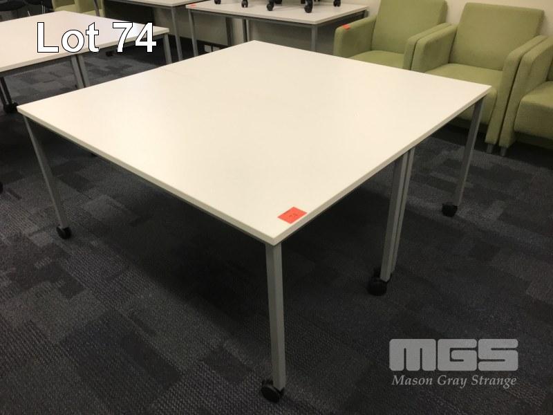 PAIR OF STEEL FRAMED TABLES, WHITE LAMINATE TOPPED, CASTOR WHEELS TO BASE