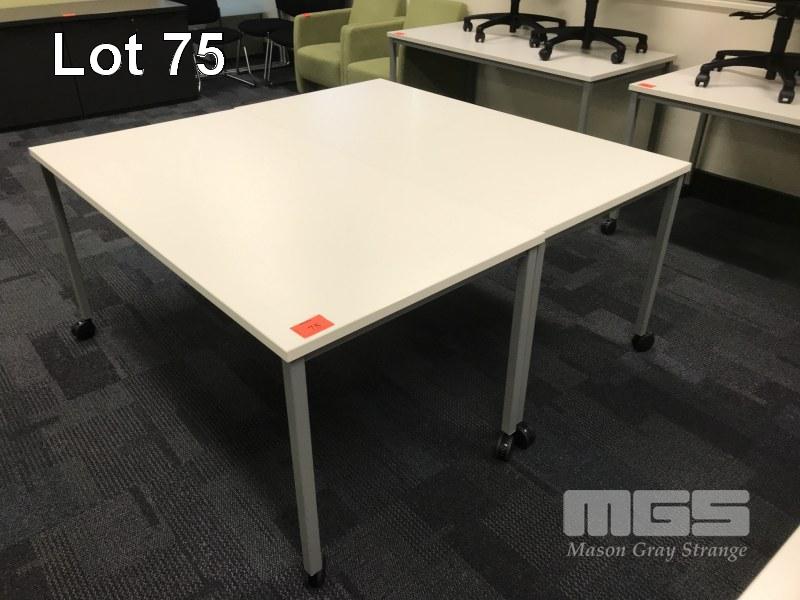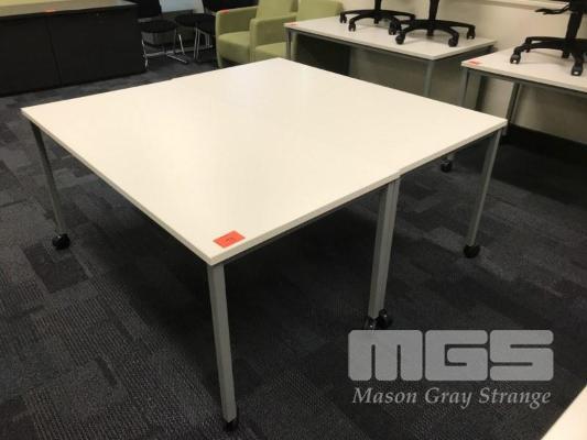 PAIR OF STEEL FRAMED TABLES, WHITE LAMINATE TOPPED, CASTOR WHEELS TO BASE