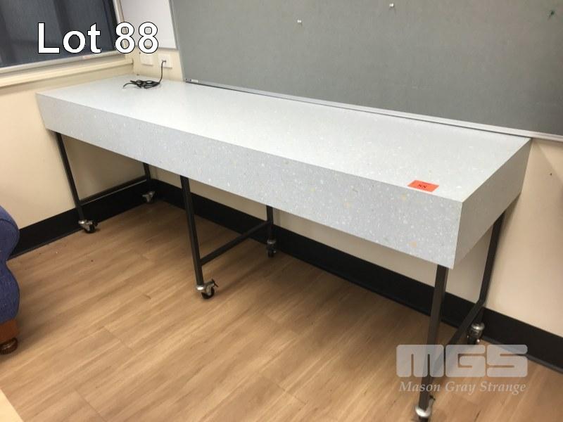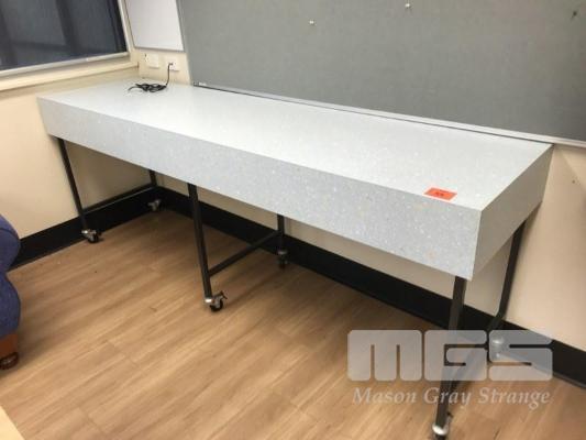 MOBILE COUNTER, STONE LOOK LAMINATE, STEEL FRAMED, 6 LOCKABLE WHEELS