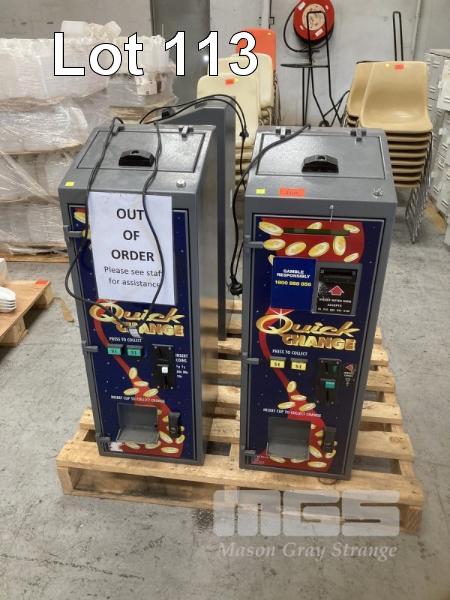 2 x COIN CHANGE MACHINES, 240V (NO KEYS, 1 x OUT OF ORDER))