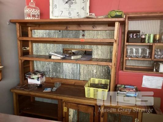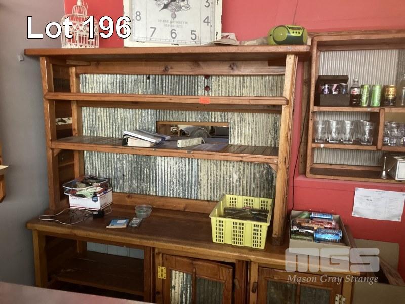 RUSTIC TIMBER CUPBOARD, 280cm, 2 DOOR WITH 2 x 3 TIER OVER SHELVES, MINI ORB BACKING SOLD INSITU - 186 PORT ROAD, HINDMARSH, BUYER TO REMOVE