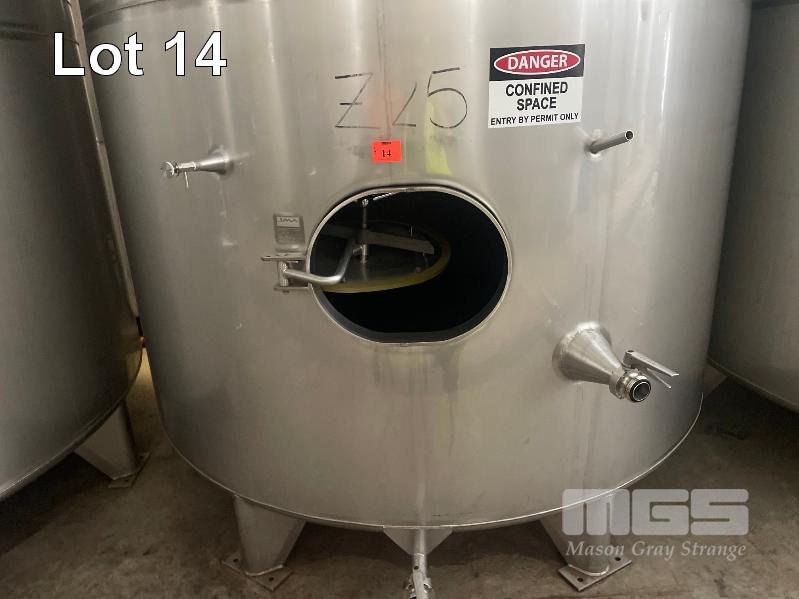 2007 STAINLESS STEEL WINE TANK, JMA ENGINEERING 15kl APPROX SUPPORT LEG BASE, VALVES, COOLING PLATE THERMOMETER POCKET & LADDER HOOK ID NO: Z25