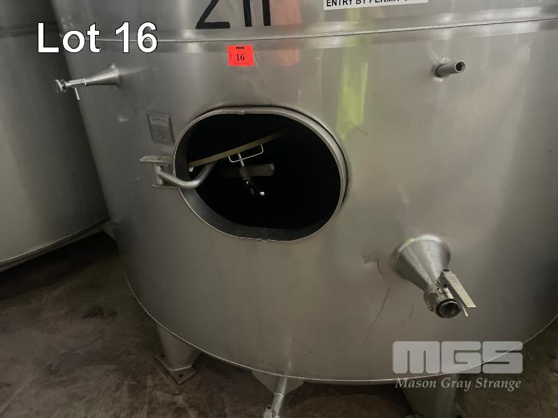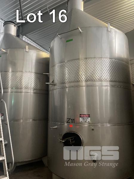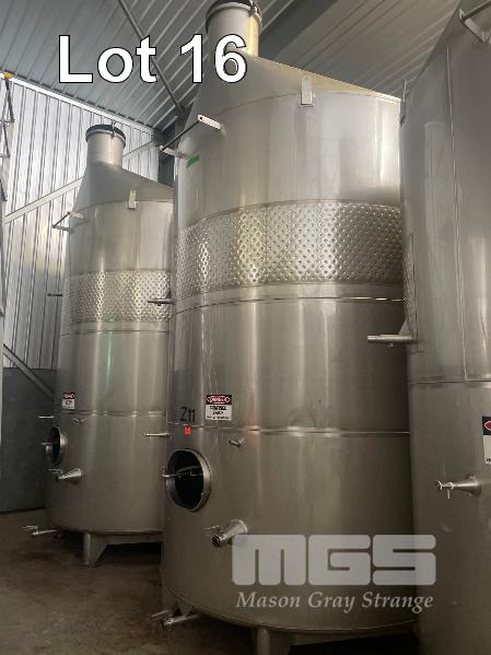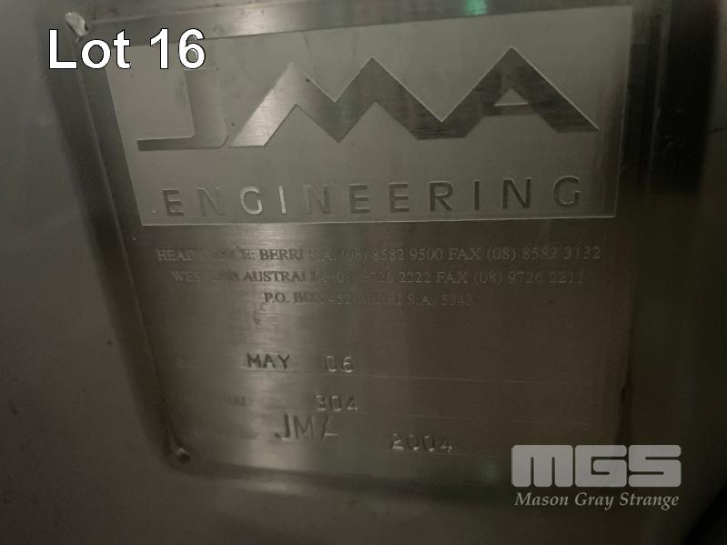2006 STAINLESS STEEL WINE TANK, JMA ENGINEERING 20kl APPROX SUPPORT LEG BASE, VALVES, COOLING PLATE THERMOMETER POCKET & LADDER HOOK ID NO: Z11 (WILL HAVE TO BE LAID OVER IN THE WAREHOUSE TO REMOVE BY CRANE, AS THEY WILL NOT COME OUT THE DOOR VERTICALLY)