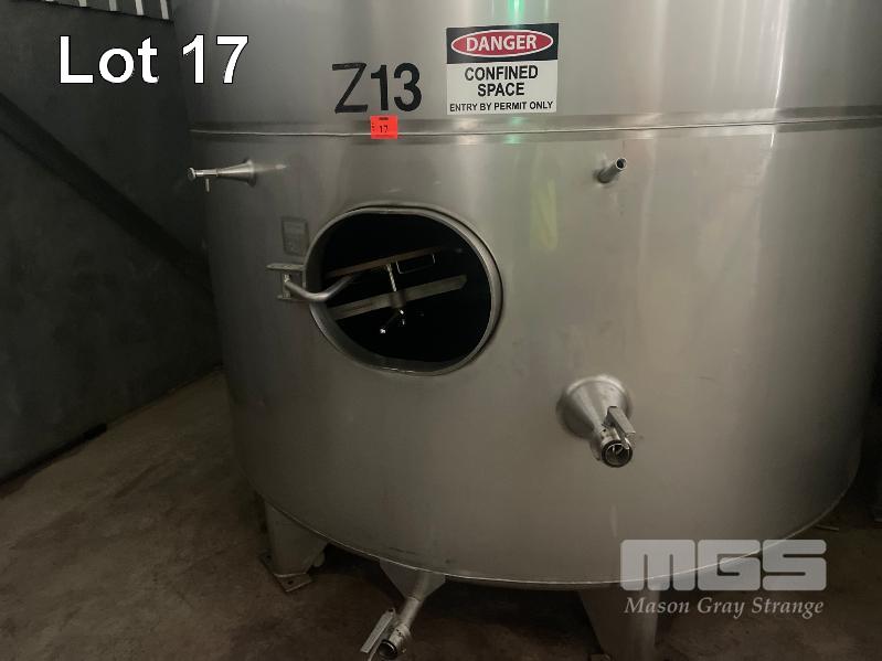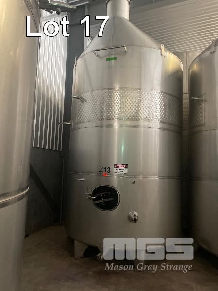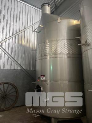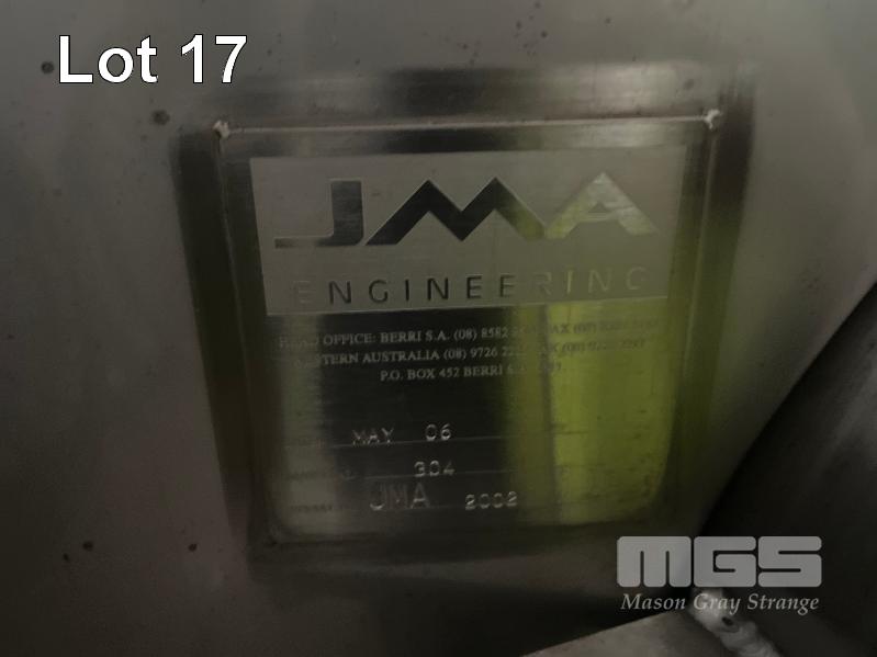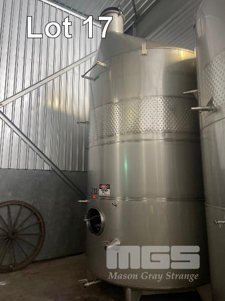 2006 STAINLESS STEEL WINE TANK, JMA ENGINEERING 20kl APPROX SUPPORT LEG BASE, VALVES, COOLING PLATE THERMOMETER POCKET & LADDER HOOK ID NO: Z13 (WILL HAVE TO BE LAID OVER IN THE WAREHOUSE TO REMOVE BY CRANE, AS THEY WILL NOT COME OUT THE DOOR VERTICALLY)