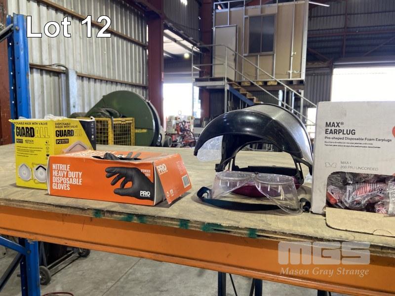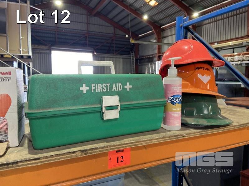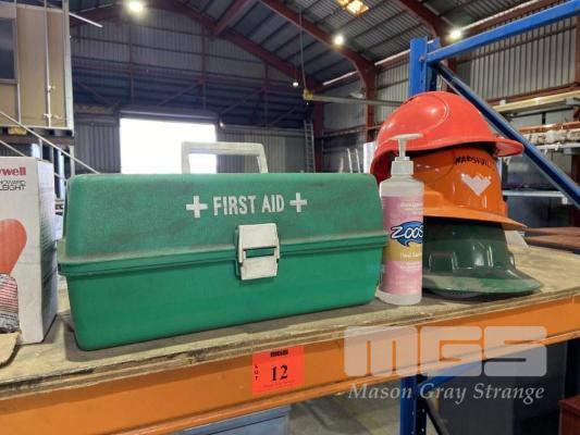 CONTENTS OF SHELF FIRST AID, ASSORTED PPE, HEAD SHIELD, HARD HATS, FACE MASKS ETC.