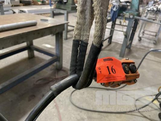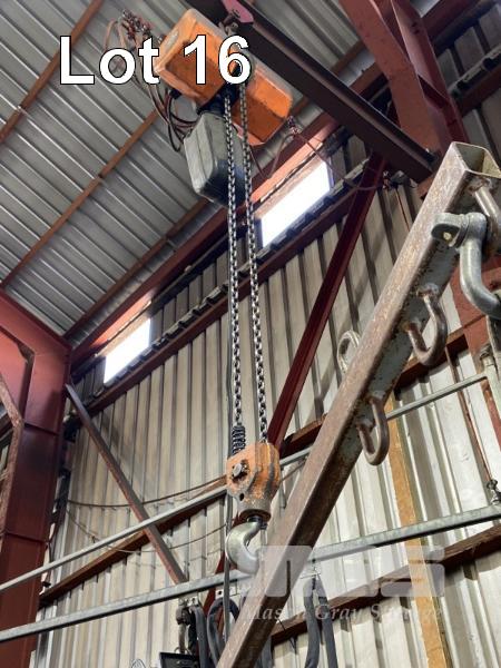 HITACHI 2 TONNE PENDANT CONTROL OVERHEAD CHAIN HOIST WITH SPREADER BAR, FITTINGS & TROLLEY