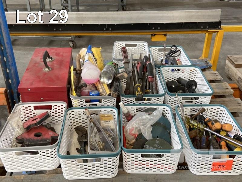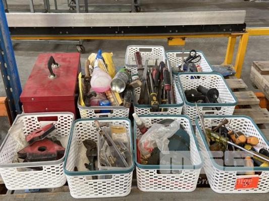 ASSORTED TOOLS, SCREW DRIVERS, FILES, MAGNETIC SQUARES, AIR FITTINGS ETC.
