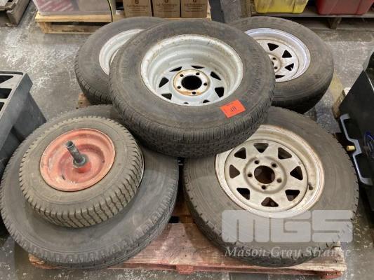 4 x 5 STUD STEEL RIMS, 185/14 1 x WHEELBARROW TIRE 1 x 5 STUD RIM