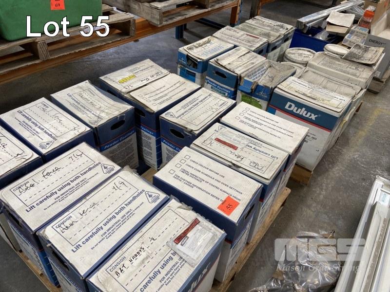 CONTENTS OF 2 PALLETS, POWDER COATING, VARIOUS COLOURS, APPROX 22 PART BOXES, 6 x TUB'S