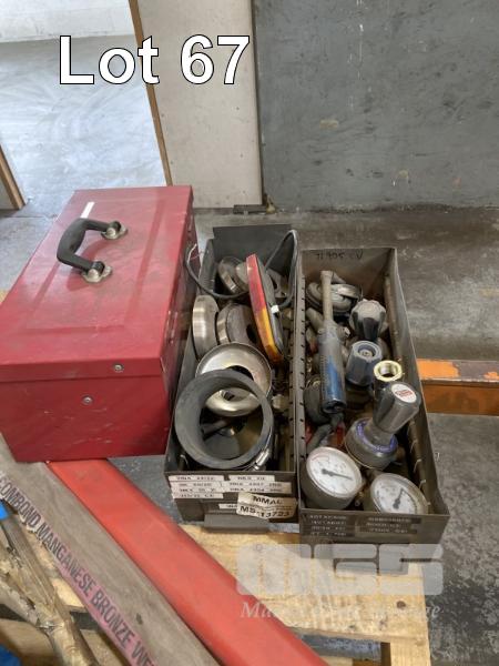ASSORTED MIG WIRE, HAND PIECE WITH FEED, OXY ACC GAUGES, WIRE & TOOL BOX