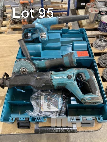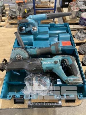 MAKITA BATTERY TOOL KIT, 125mm ANGLE GRINDER, BLOWER, 13mm DRILL, RECIPRO SAW, CHARGER, CARRY CASE (NO BATTERIES)