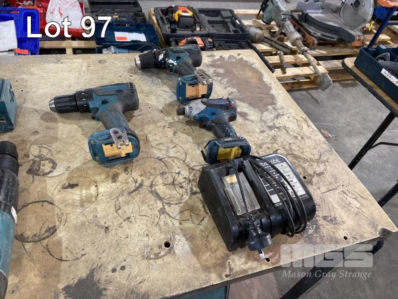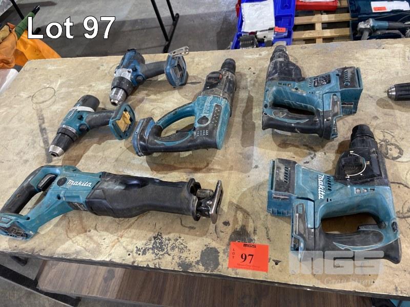 ASSORTED MAKITA TEK GUNS, HAMMER DRILLS, RECIPRO SAWS, CHARGER, CARRY BAG, NO BATTERIES