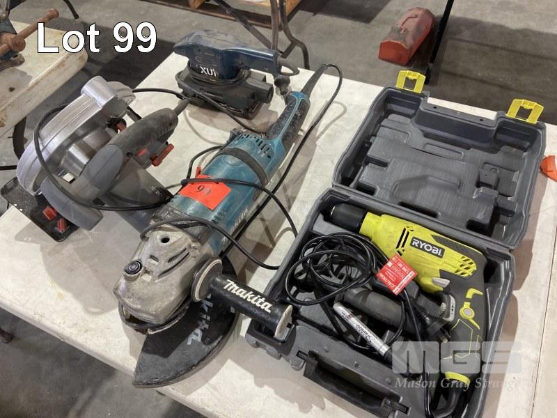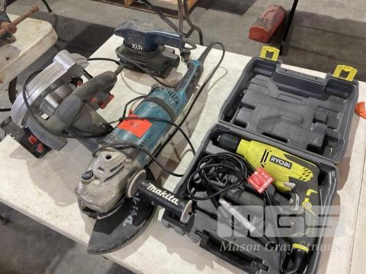 240v POWER TOOLS, MAKITA 9 INCH ANGLE GRINDER, RYOBI DRILL, OZITO CIRCULAR SAW, LUX SANDER