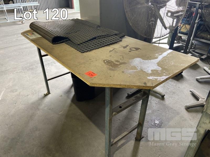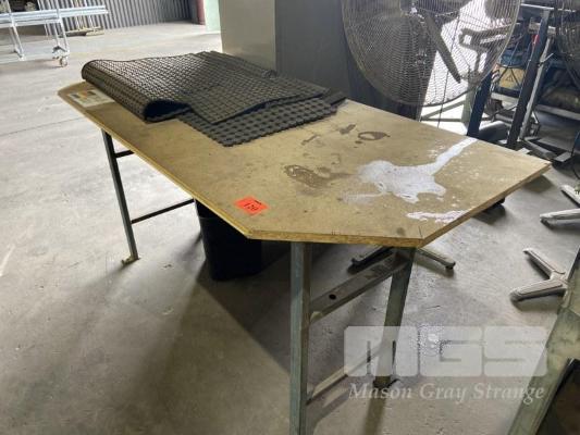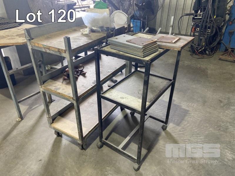 STEEL FRAME TIMBER TOP WORKBENCH, 1800mm + 2 x MOBILE WORK TROLLEYS