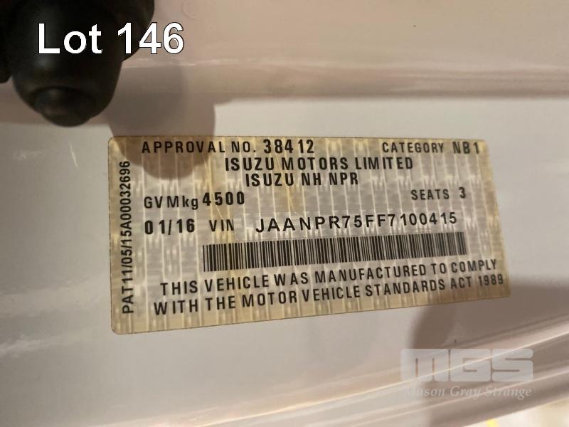 2016 IZUSU NH NPR TRADEPACK 45/155 4x2 REG: S591BMC (SA) VIN: JAANPR75FF7100415 ODO: 90,602 GVM: 4500 6 SPEED MANUAL, DIESEL, 3 SEAT, AIR CON, ALLOY TRAY, BULL BAR, NAVIGATION, 3500 x 2120mm TRAY, DROP SIDES WITH CARRY RACKS (WITH PAPERS, WITH 1 KEY/S, WITH OWNER'S MANUAL, WITH SERVICE BOOKS)