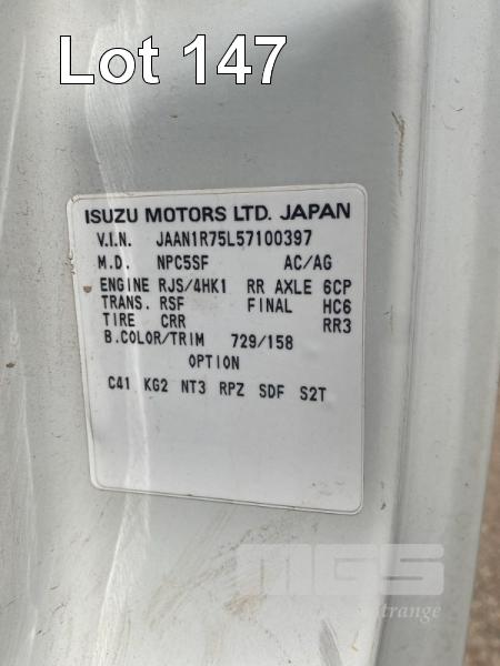 2006 IZUSU NQR 450 4x2 SITEC 175 TIPPER REG: XI2398 (SA) ODO: 131,246 GVM: 8500 LENGTH: 3400 x 2000mm 6 SPEED MANUAL, DIESEL, 2 DOORS, 3 SEAT, AIR CON, 2 WAY TAILGATE, TOW BAR, NAVIGATION (WITH PAPERS, WITH 1 KEY/S, WITH OWNER'S MANUAL, WITH SERVICE BOOKS)
