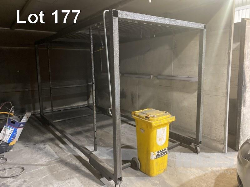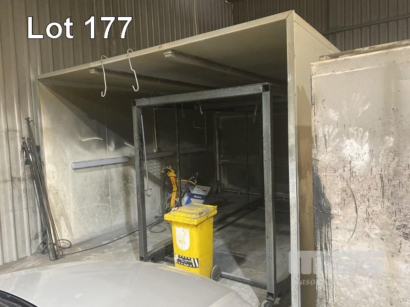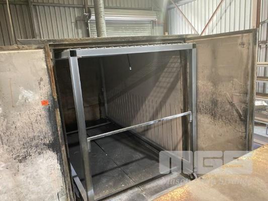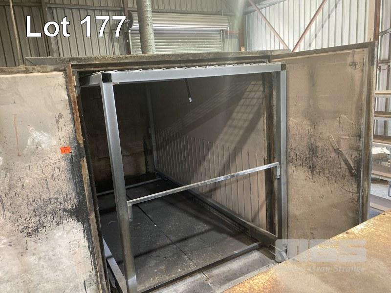 NATURAL GAS POWDER COATING OVEN, 4200 x 2000 x 2200mm, WITH 2 x ROLLING RACKS TO SUIT & PREP BENCH