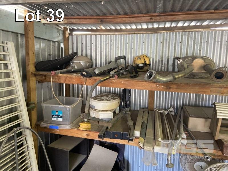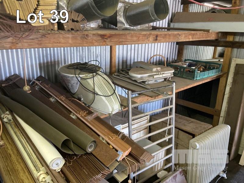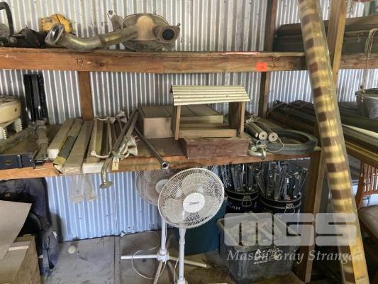 DIMPLE HEATER, TOWEL RAILS, BRUSH CUTTER, LAMPS, IRON PRESS, ETC CONTENTS BACK TIMBER RACK