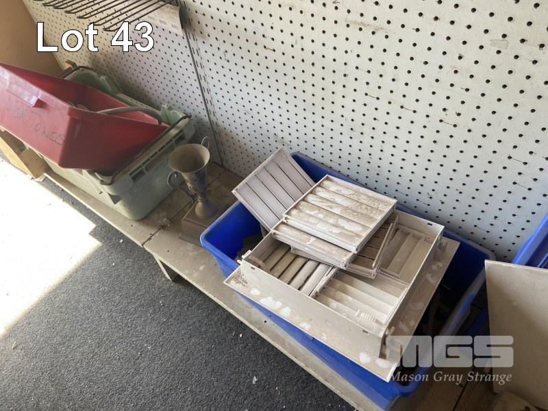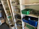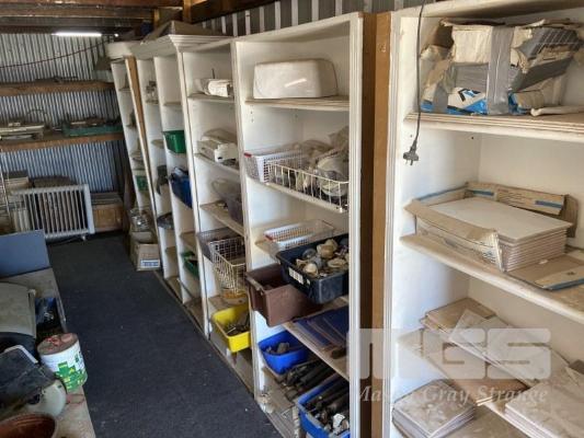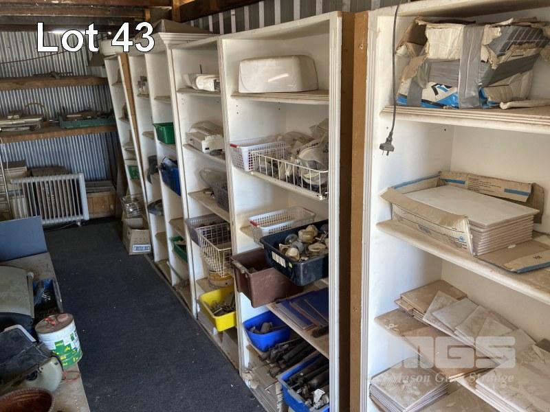 5 x BAYS DOUBLE SIDED DISPLAY SHELVES & 5 x ORNATE SHELF UNITS, WHITE & CONTENTS INC HARDWARE, LIGHTS, DOOR CLOSERS, VENTS, TILES, ETC