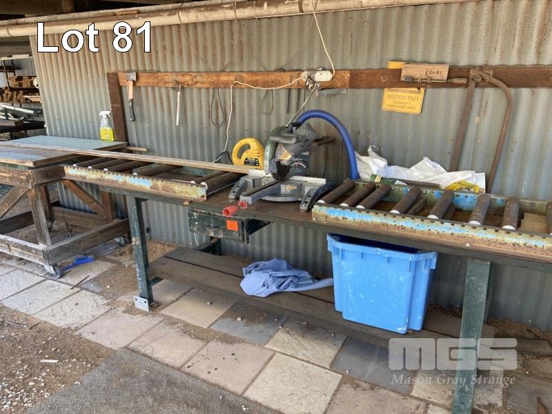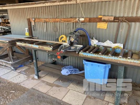 MITRE SAW BENCH, OZITO SLIDING COMPOUND SAW & HEAVY DUTY STEEL BASE WITH ROLLER TABLE FRAME