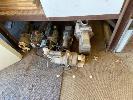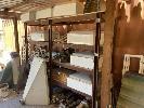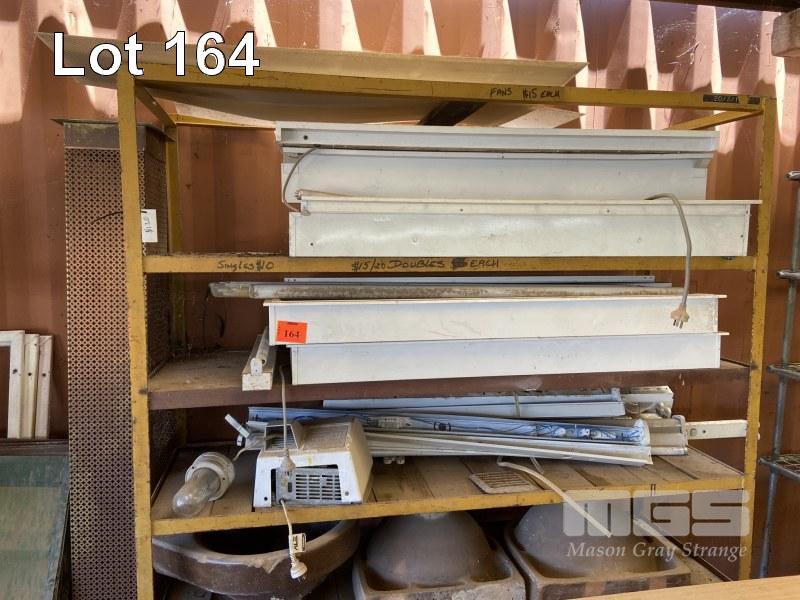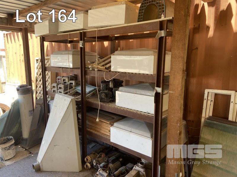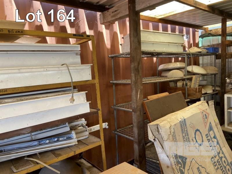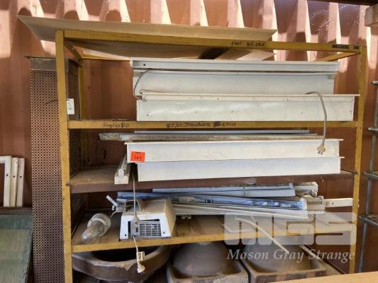 ASSORTED FLURO LIGHT BOXES, PUMPS, POST BASES, ROOFING, SURROUNDS ON WALL & 3 x STEEL RACKS