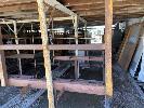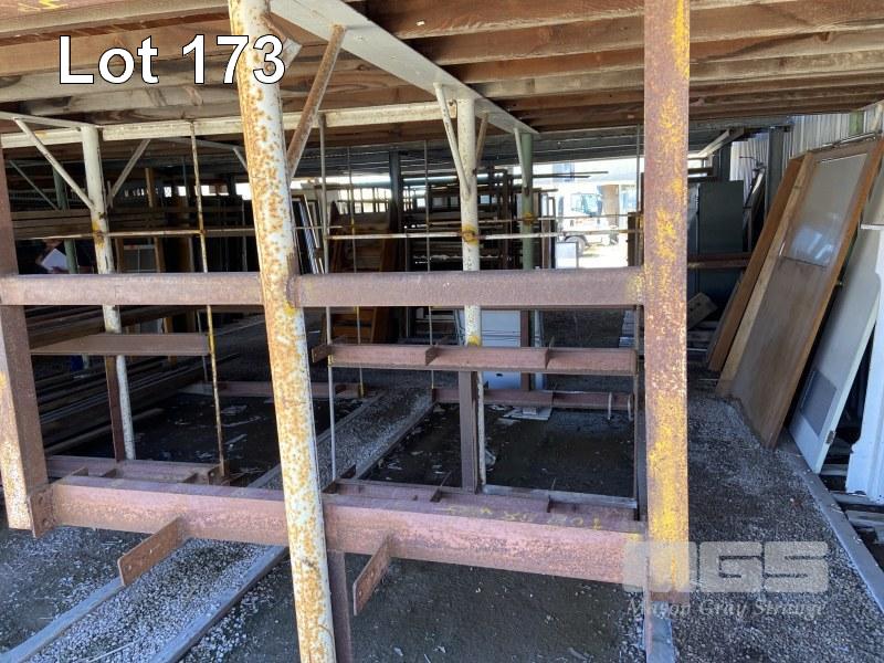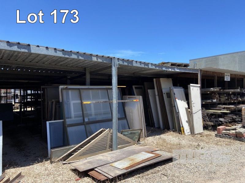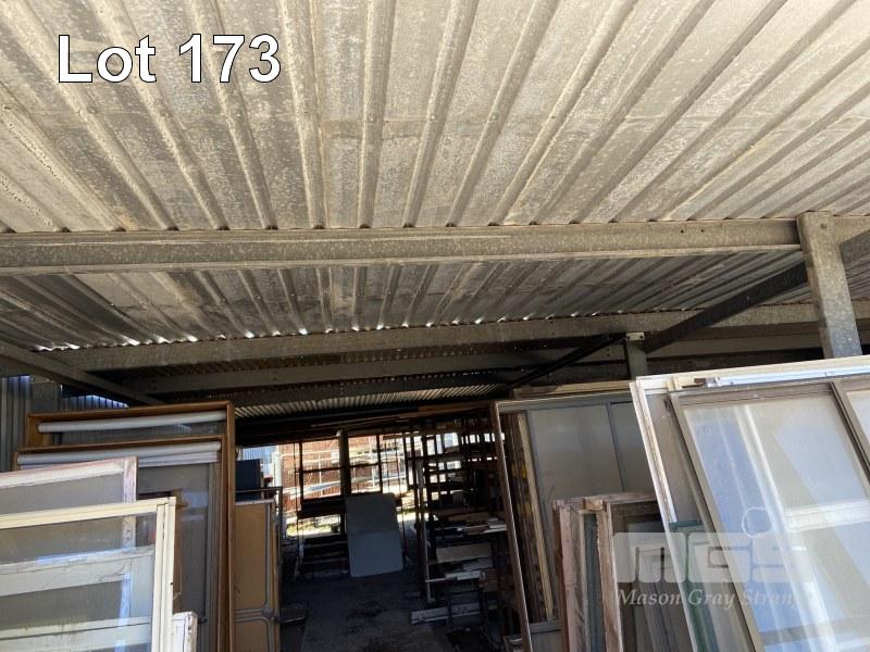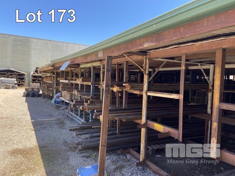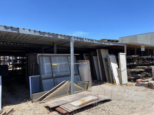 SALVAGE YARD STORAGE LEAN TO 18 x 26m APPROX WITH CONSTRUCTED TIMBER RACKS STEEL SUPPORT RACKS HARDWOOD SUPPORT POSTS FRAMING TIMBER, PLANKS, ASSORTED BUYER TO REMOVE
