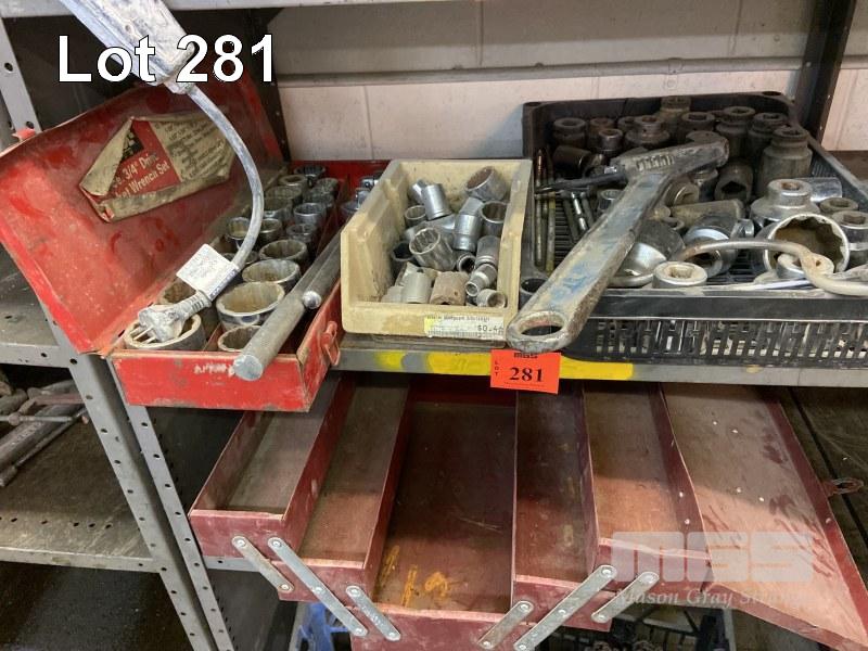 HUGE QUANTITY 3/4 1/2" SOCKETS, BIG SHIFTER & TOOL BOX