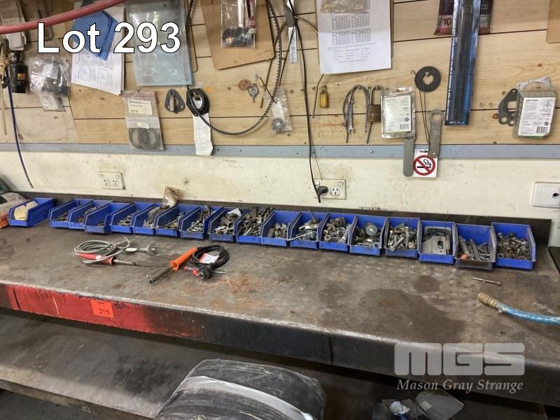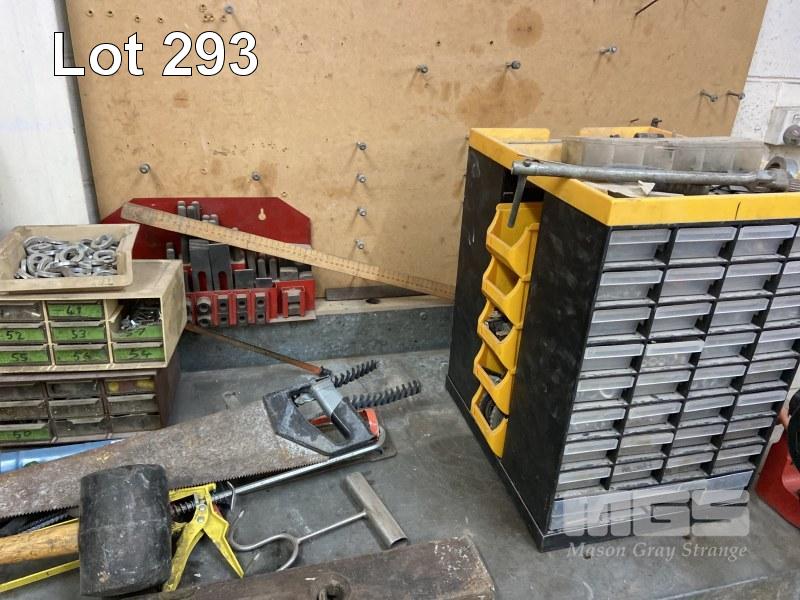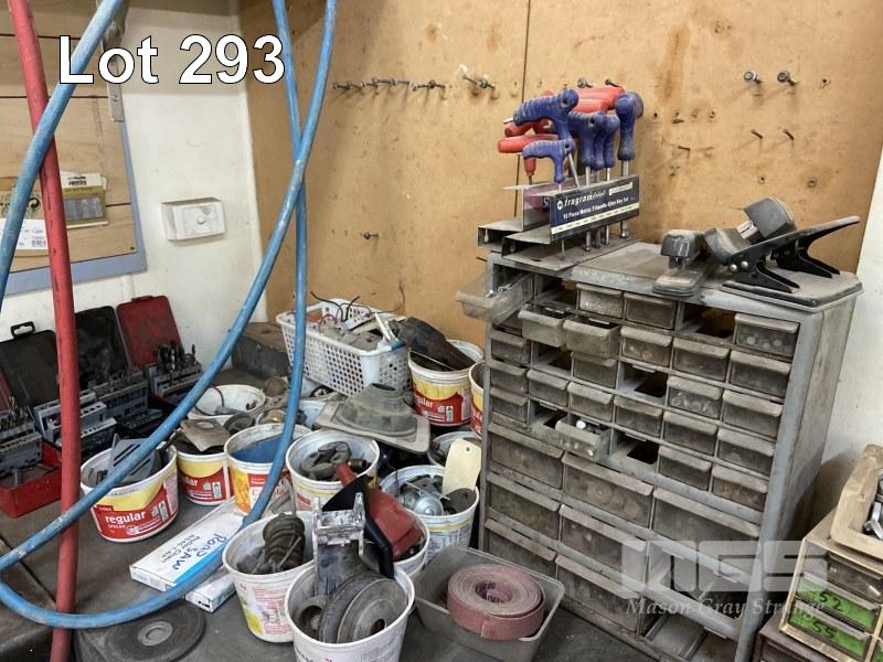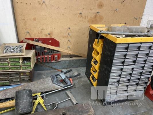 BENCH TOOLS INCLUDING T BOLT SET, FASTENER SETS, DRAWER UNITS, DRILL BITS, SOLDERING IRONS, ETC