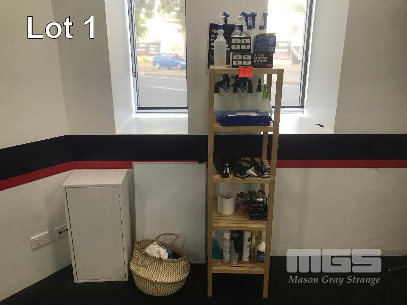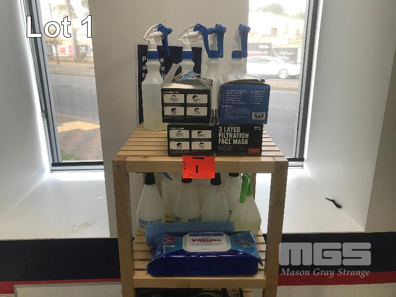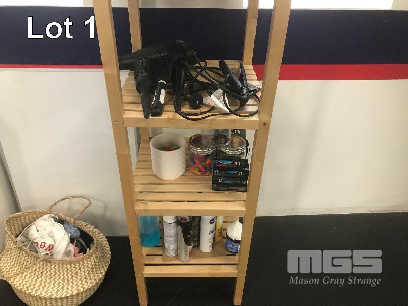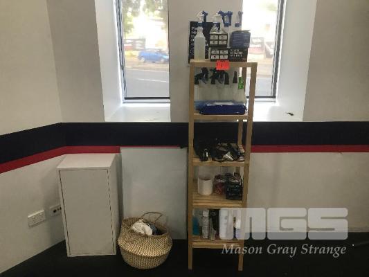 TIMBER 5 TIER SHELF UNIT, WHITE WALL MONT CABINET & CONTENTS INC HAIR DRYER & HAIR STRAIGHTENER, ANTIBACTERIAL WIPES, FACE MASKS, GLOVES, FEMALE SANITARY ITEMS, WOVEN BASKET ETC