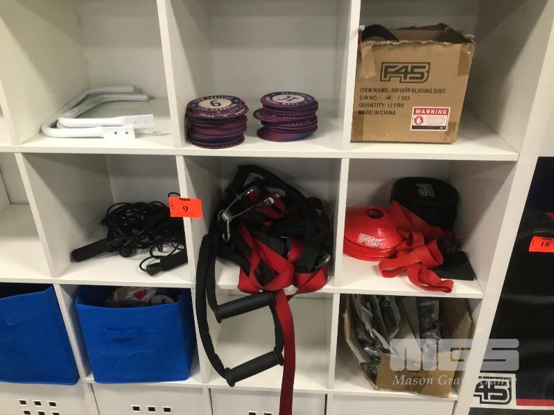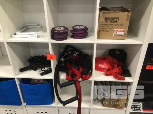 ASSORTED CIRCUIT EQUIPMENT, SKIPPING ROPES, MARKER CONES, FASTENERS, STRAPS, STATION NUMBERS ETC