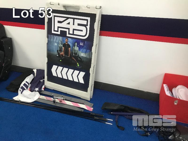 ASSORTED F45 MERCHANDISE, NEW GLOVE INSERTS, 2 X TEAR DROP FLAG SETS, FRIZBEE'S CANDLES, KEYRINGS, AGILITY SQUARES, MMA GLOVES, BLOW MOULD A-FRAME SIGN & MORE