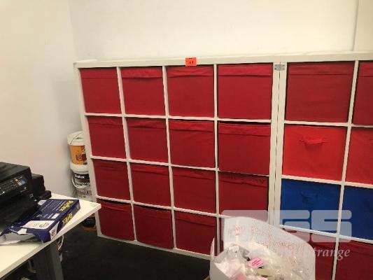 WHITE PIGEON HOLE SHELVING UNIT, 16 COMPARTMENT WITH FABRIC TUB INSERTS