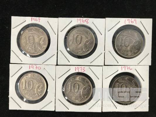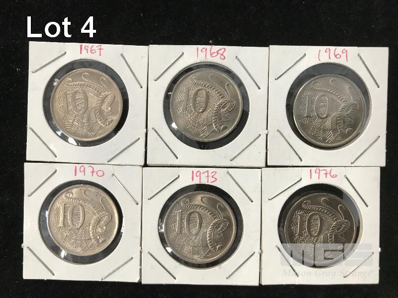 6 X AUSTRALIAN UNC 10 CENT PIECES, 1967, 68, 69, 70, 73 & 1976