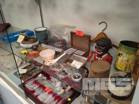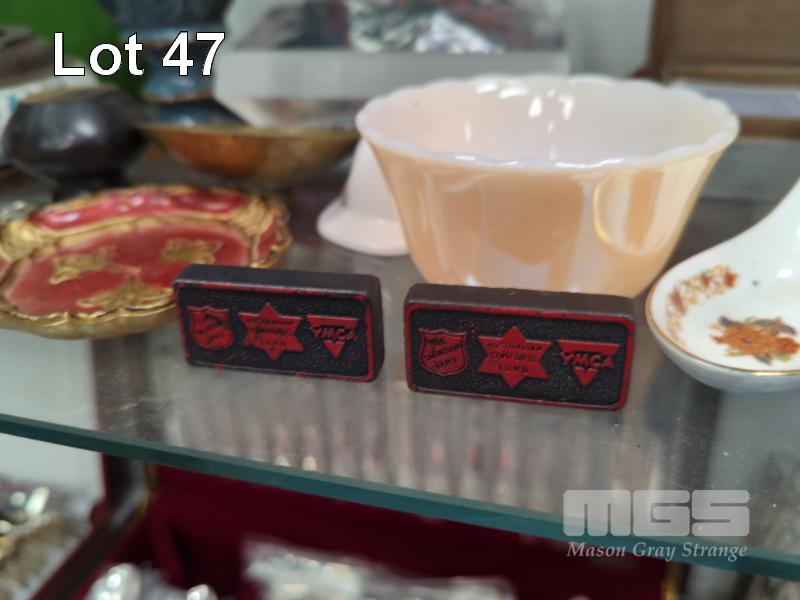 ASSORTED COLLECTABLES, YMCA/SALVATION ARMY DOMINOES, TOBACCO PIPE, TRAVEL CLOCK, ETC