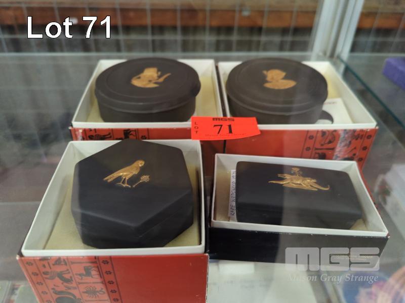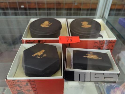 4 x WEDGWOOD BLACK JASPERWARE LIDDED DISHES, 1 x ALL FAULTS TO INSIDE RIM