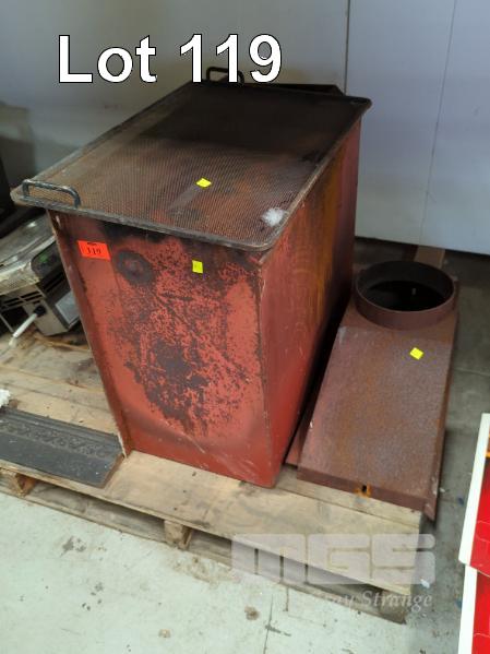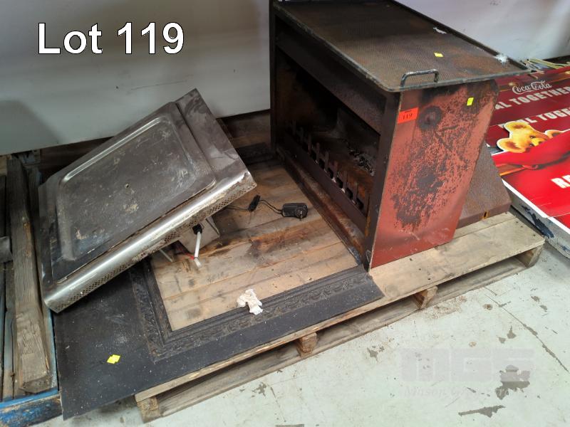CAST IRON FIREPLACE WITH MESH FRONT, IRON EXHAUST CANOPY, FIREPLACE SURROUND & NATIONAL GAS BBQ HOT PLATE