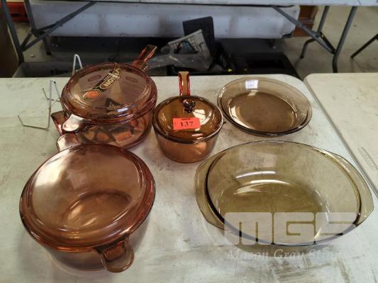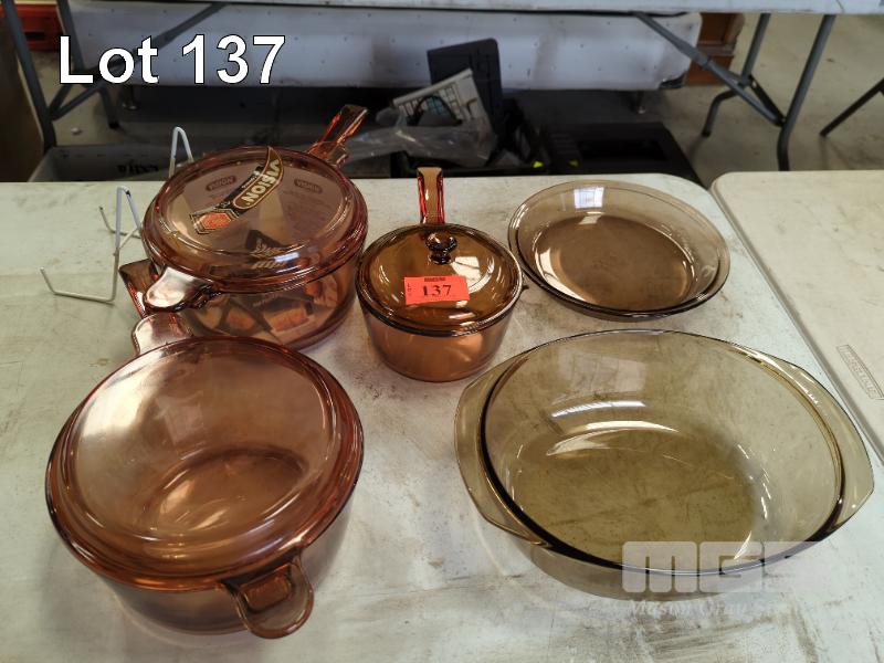 CORNINGWARE VISION LIDDED SAUCEPAN SET, PYREX PLATE, ETC