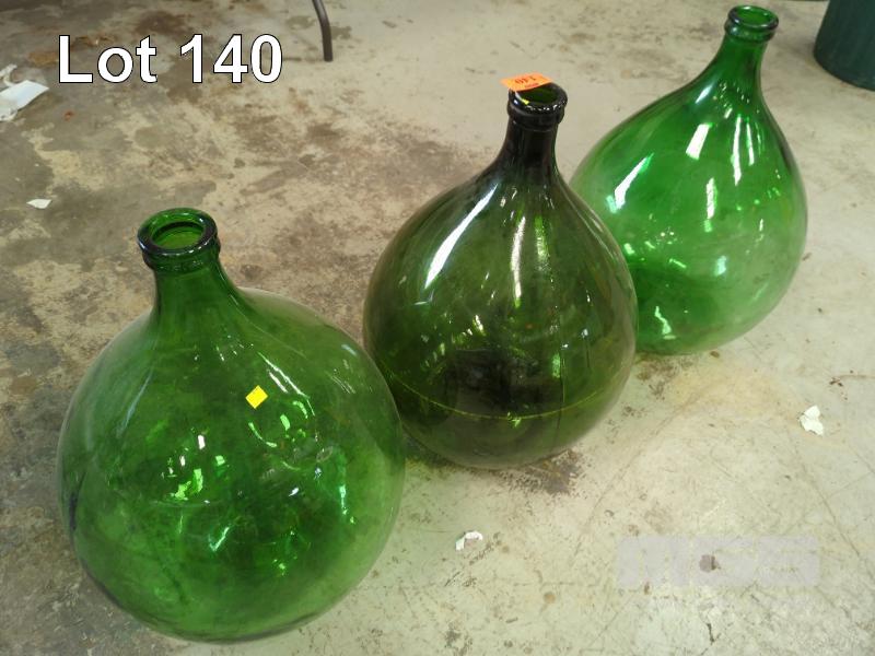 3 x GREEN GLASS DEMIJOHNS, APPROX 60 LITRE