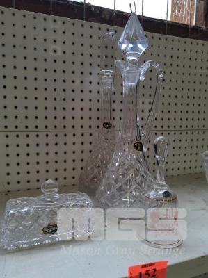 2 x BOHEMIA DECANTERS, BUTTER DISH & BELL