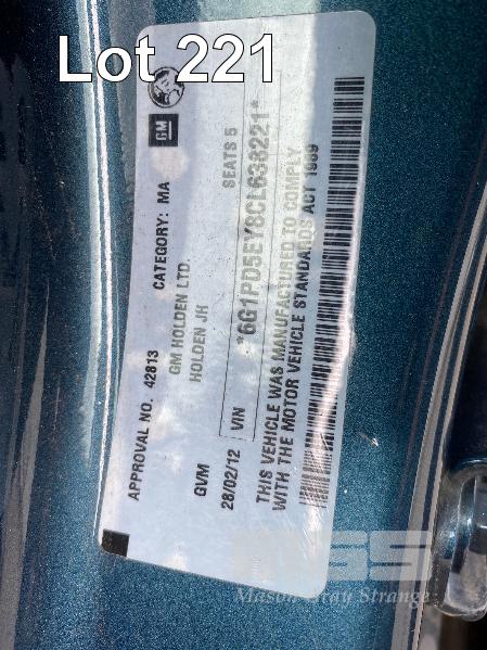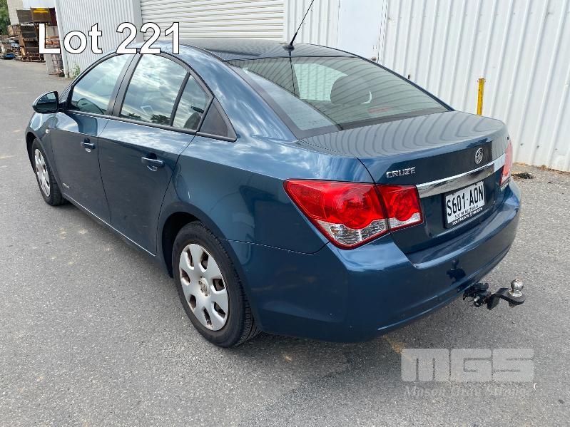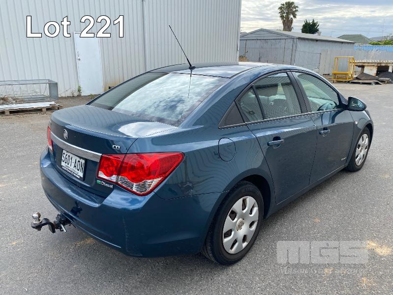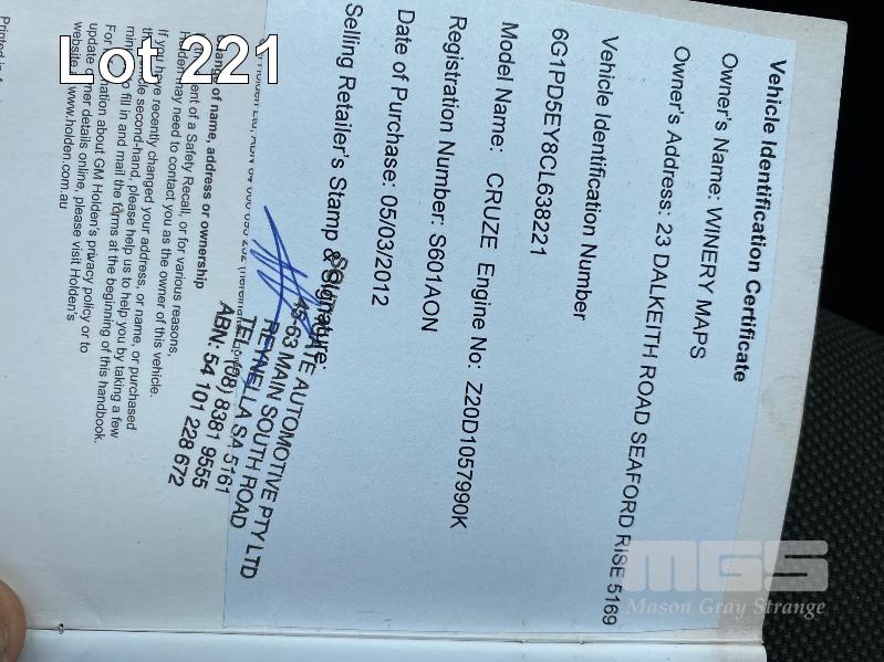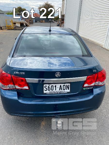 2012 HOLDEN JH CRUZE CD SEDAN REG: S601 AON VIN: 6G1PD5EY8CL638221 ENG: Z20D1057990K ODO: 305,360kms SHOWING 4 CYLINDER, 5 SPEED MANUAL TRANSMISSION, TURBO DIESEL, BLUE DUCO, 4 DOORS, 5 SEAT, AIR BAG, AIR CON, CD PLAYER, CENTRAL LOCKING, CRUISE CONTROL, IMMOBILISER, POWER STEERING, POWER WINDOWS, SPARE WHEEL, TOW BAR (WITH 1 KEY/S, WITH OWNER'S MANUAL, WITH SERVICE BOOKS)