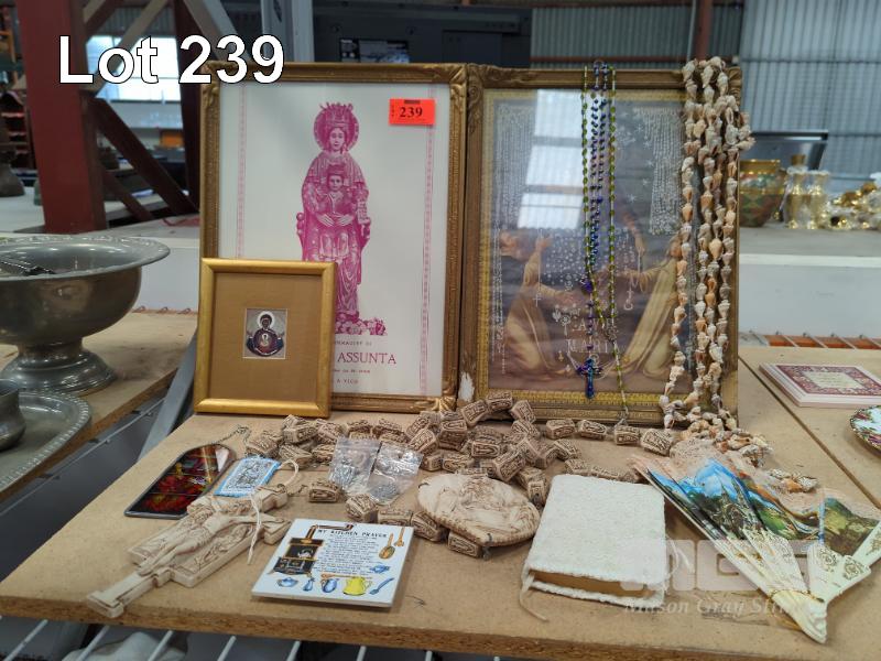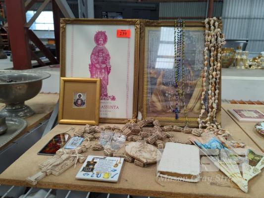 ASSORTED RELIGIOUS ITEMS INC LARGE ROSARY BEADS, FRAMED PICTURES, ETC
