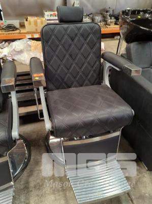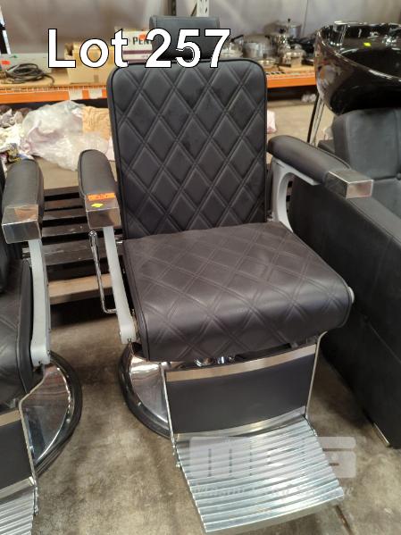 BARBERS CHAIR, BLACK VINYL UPHOLSTERED, CHROME FOOT STAND, HAND PUMP, GAS LIFT