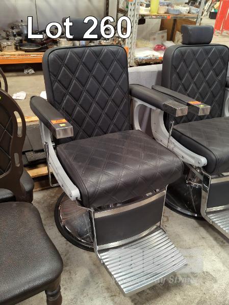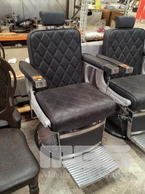 BARBERS CHAIR, BLACK VINYL UPHOLSTERED, CHROME FOOT STAND, HAND PUMP, GAS LIFT
