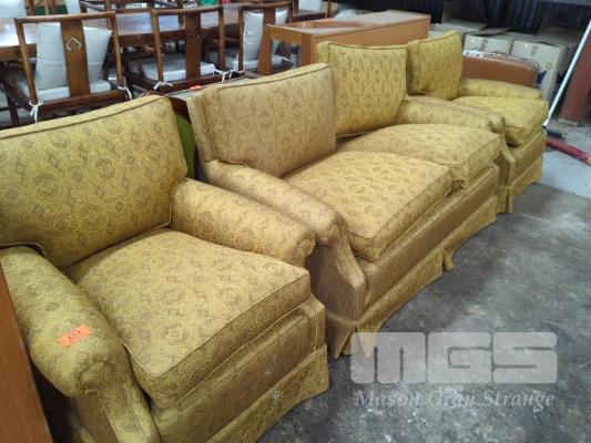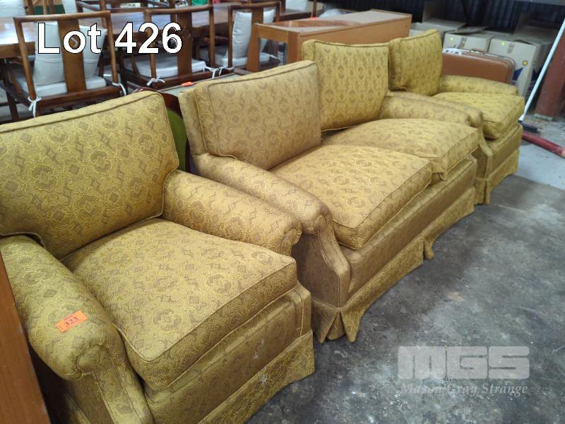 3 PIECE LOUNGE SUITE, GOLD FABRIC COMPRISING 2 SEATER & 2 x SINGLE SEATER ARM CHAIRS ON CASTORS
