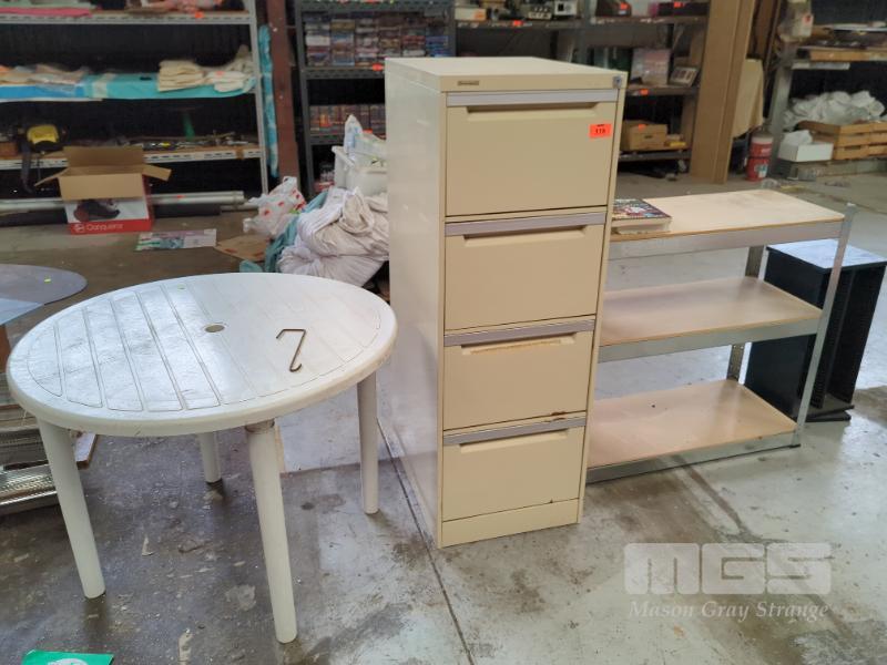 BEIGE 4 DRAWER FILING CABINET & GALV SHELF UNIT, CD TOWER, PLASTIC OUTDOOR TABLE
